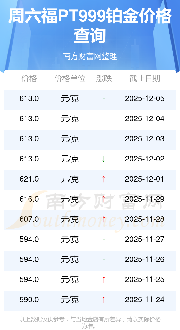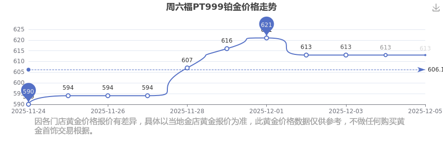 613.0元/克成為周六福今日 PT999鉑金價格的最新交易的價格。