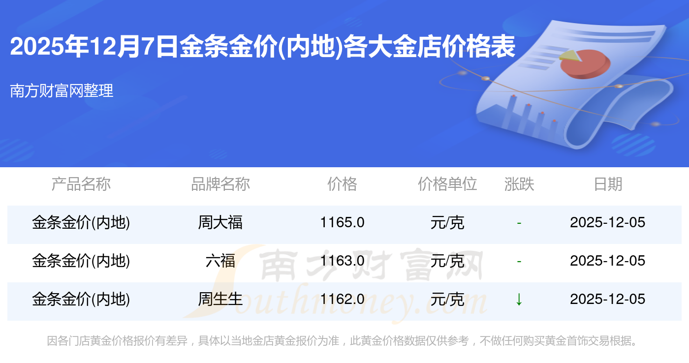 2025年12月7日周大福、周大福、周大福、周大福、周大福、周大福、周大福、老鳳祥、老鳳祥、老鳳祥、周六福等各大金店品牌金條金價(內地)最新價格如下:周大福黃金價格1328.0元/克,周大福鉑金價格662.0元/克,周大福飾品金價(內地)1328.0元/克,周大福黃金飾品(香港)46550.0,周大福鉑金價格(香港)18970.0,周大福金條價格(香港)41990.0,周大福金條金價(內地)1165.0元/克,老鳳祥黃金價格1325.0元/克,老鳳祥鉑金價格600.0元/克,老鳳祥足金價格1325.0元/克,周六福黃金價格1289.0元/克。