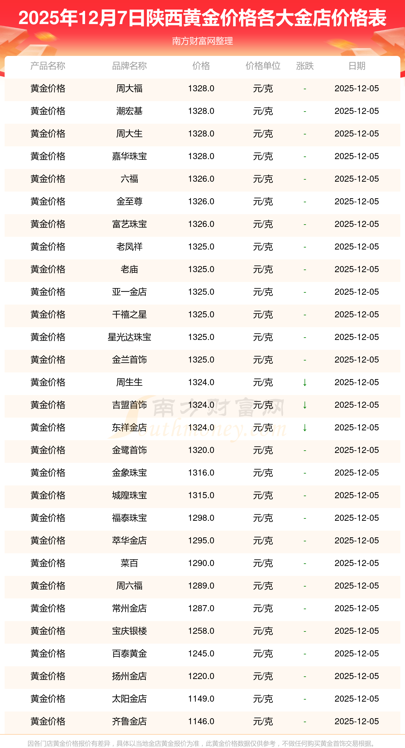 2025年12月7日陜西各大金店黃金價格最新價格查詢來了:周大福1328.0元/克,周大福662.0元/克,周大福1328.0元/克,周大福46550.0,周大福18970.0,周大福41990.0,周大福1165.0元/克,老鳳祥1325.0元/克,老鳳祥600.0元/克,老鳳祥1325.0元/克,周六福1289.0元/克。