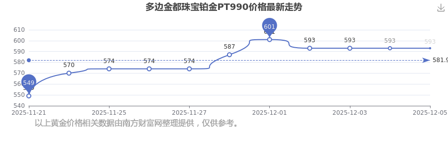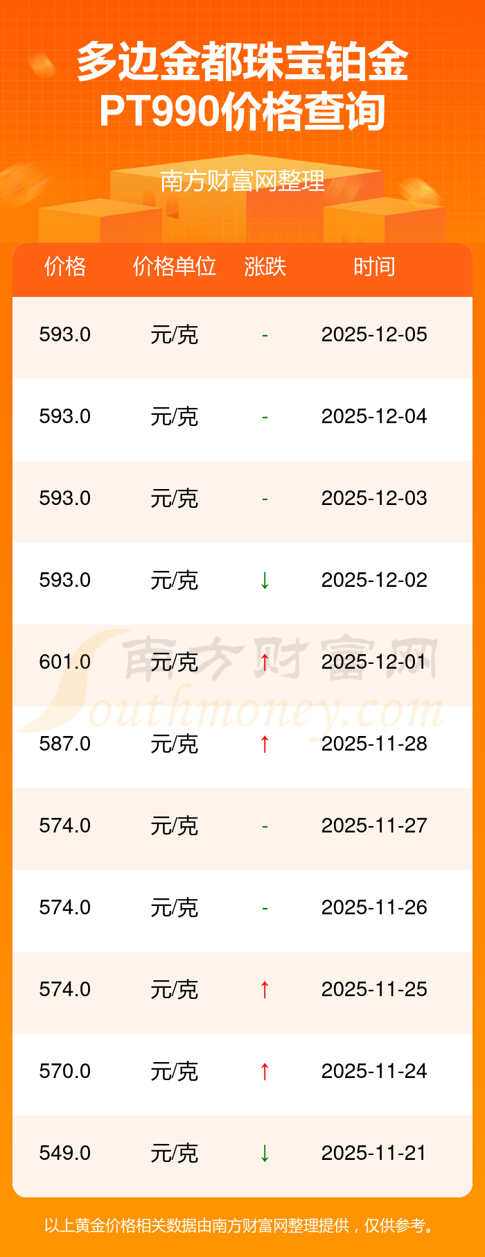 多邊金都珠寶 鉑金PT990今日最新的價位是593.0元/克。