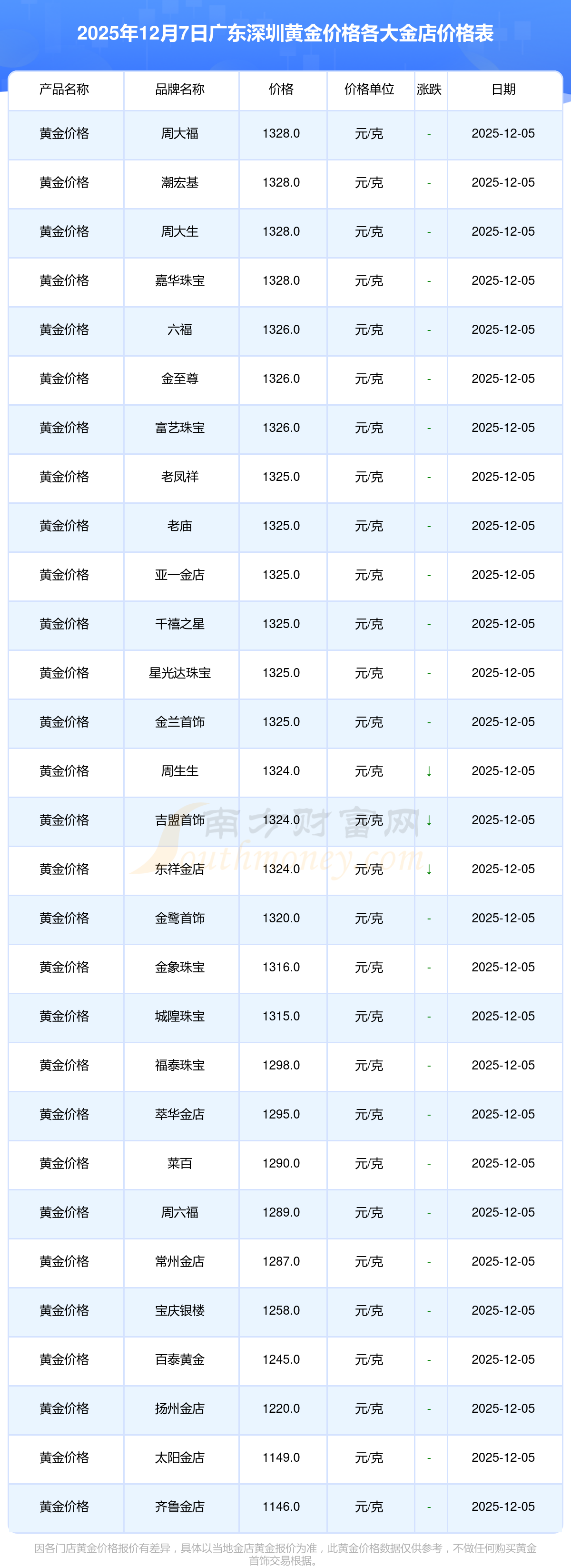 2025年12月7日,廣東深圳周大福、周大福、周大福、周大福、周大福、周大福、周大福、老鳳祥、老鳳祥、老鳳祥、周六福等各大金店品牌黃金價格今日價格行情最新來了:周大福1328.0元/克、周大福662.0元/克、周大福1328.0元/克、周大福46550.0、周大福18970.0、周大福41990.0、周大福1165.0元/克、老鳳祥1325.0元/克、老鳳祥600.0元/克、老鳳祥1325.0元/克、周六福1289.0元/克。