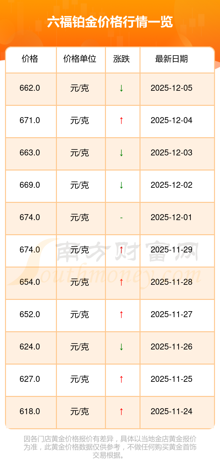 最新數據表明,六福今日 鉑金價格為662.0元/克。