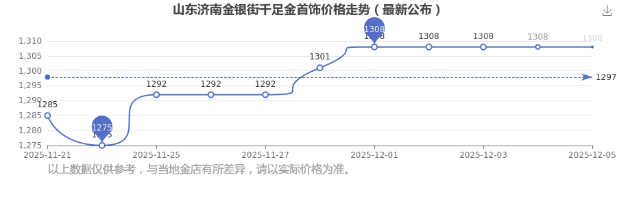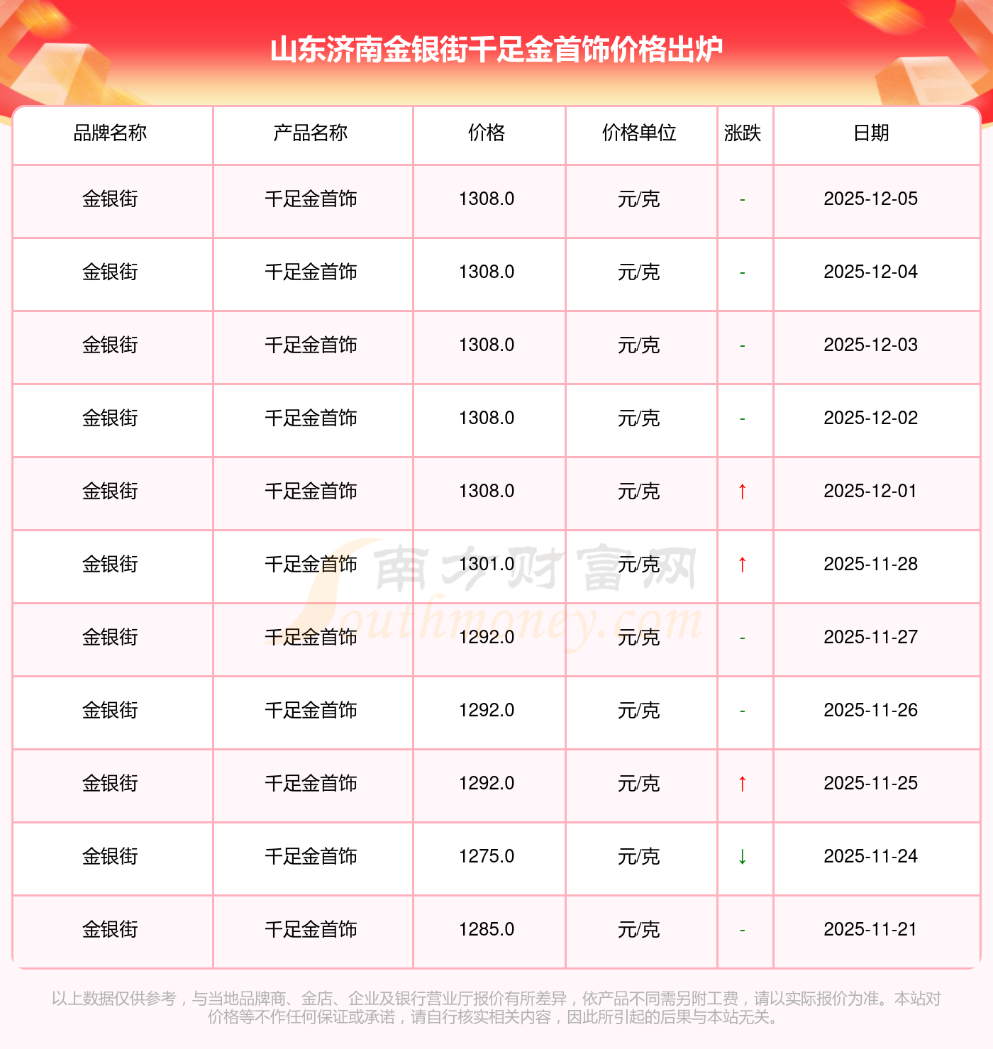 2025年12月7日,山東濟南金銀街千足金首飾每克的價值量定格在1308.0元/克。