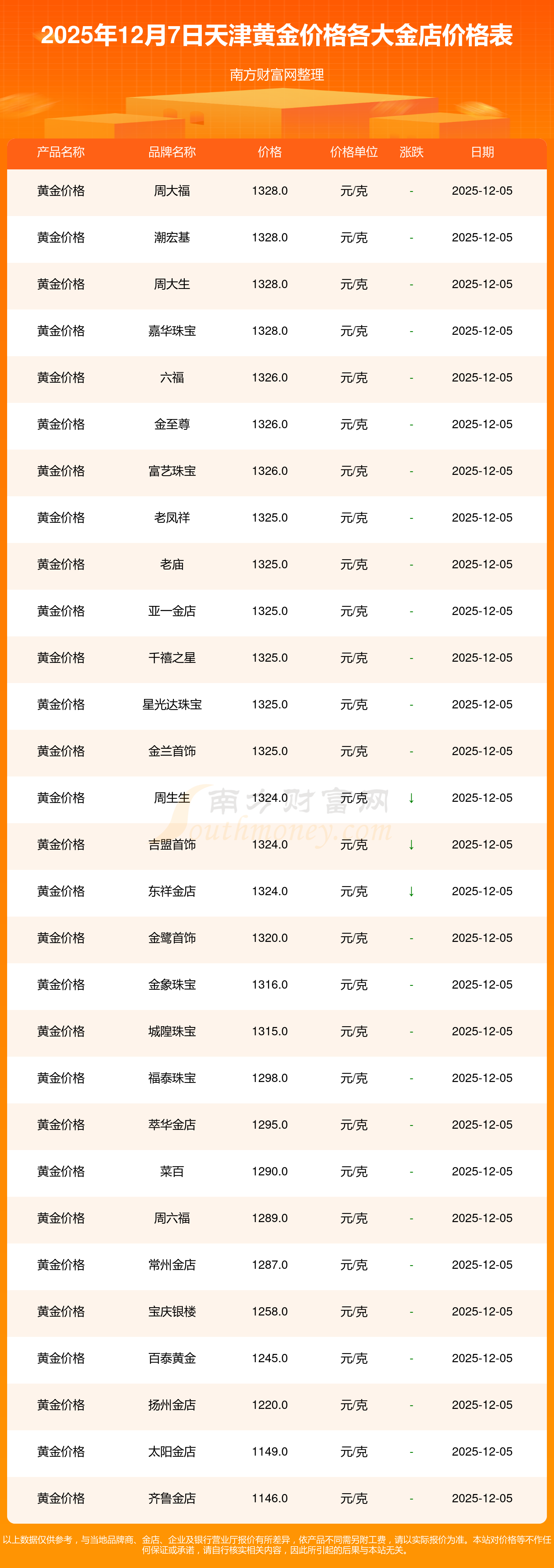 今天是2025年12月7日,天津周大福、周大福、周大福、周大福、周大福、周大福、周大福、老鳳祥、老鳳祥、老鳳祥、周六福等各大金店品牌黃金價格最新價格如下:周大福1328.0元/克、周大福662.0元/克、周大福1328.0元/克、周大福46550.0、周大福18970.0、周大福41990.0、周大福1165.0元/克、老鳳祥1325.0元/克、老鳳祥600.0元/克、老鳳祥1325.0元/克、周六福1289.0元/克。