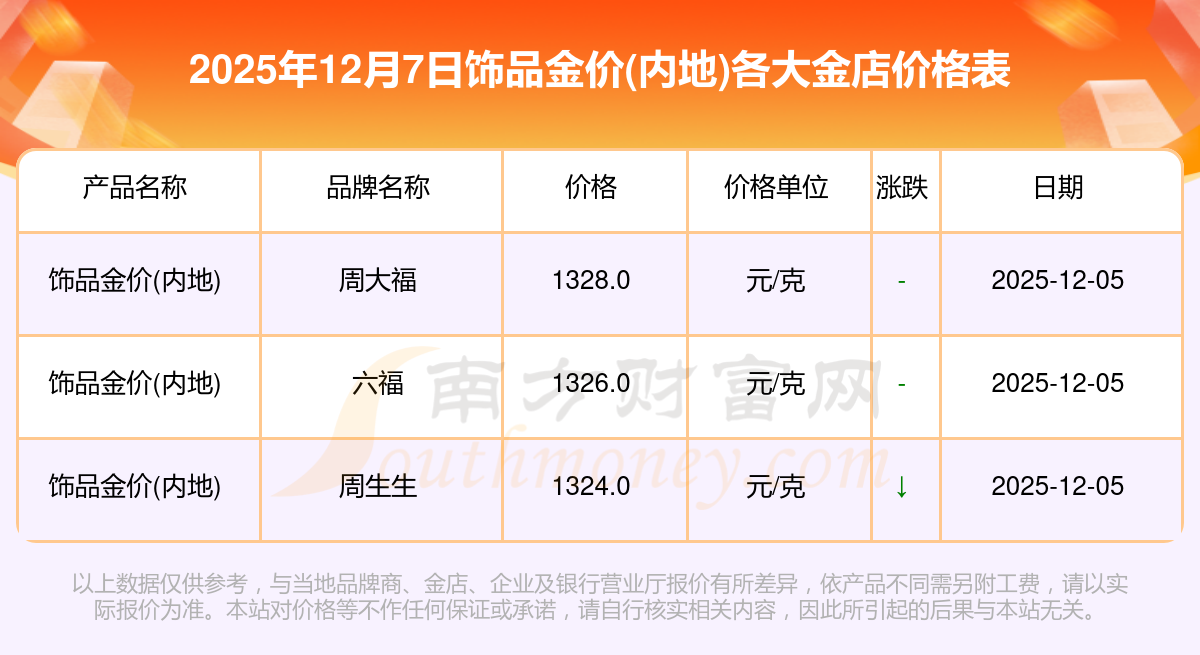 2025年12月7日周大福、周大福、周大福、周大福、周大福、周大福、周大福、老鳳祥、老鳳祥、老鳳祥、周六福等各大金店品牌飾品金價(內地)最新價格如下:周大福黃金價格1328.0元/克,周大福鉑金價格662.0元/克,周大福飾品金價(內地)1328.0元/克,周大福黃金飾品(香港)46550.0,周大福鉑金價格(香港)18970.0,周大福金條價格(香港)41990.0,周大福金條金價(內地)1165.0元/克,老鳳祥黃金價格1325.0元/克,老鳳祥鉑金價格600.0元/克,老鳳祥足金價格1325.0元/克,周六福黃金價格1289.0元/克。