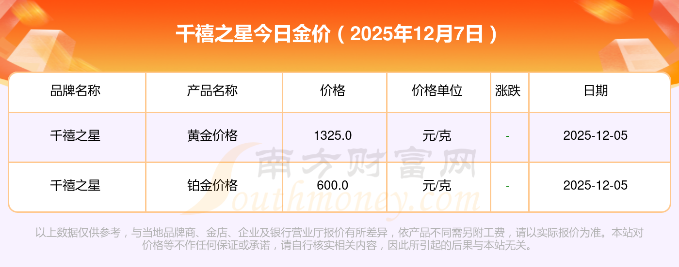 2025年12月7日,周大福、周大福、周大福、周大福、周大福、周大福、周大福、老鳳祥、老鳳祥、老鳳祥、周六福等各大金店品牌黃金價格今日價格如下:周大福1328.0元/克、周大福662.0元/克、周大福1328.0元/克、周大福46550.0、周大福18970.0、周大福41990.0、周大福1165.0元/克、老鳳祥1325.0元/克、老鳳祥600.0元/克、老鳳祥1325.0元/克、周六福1289.0元/克。