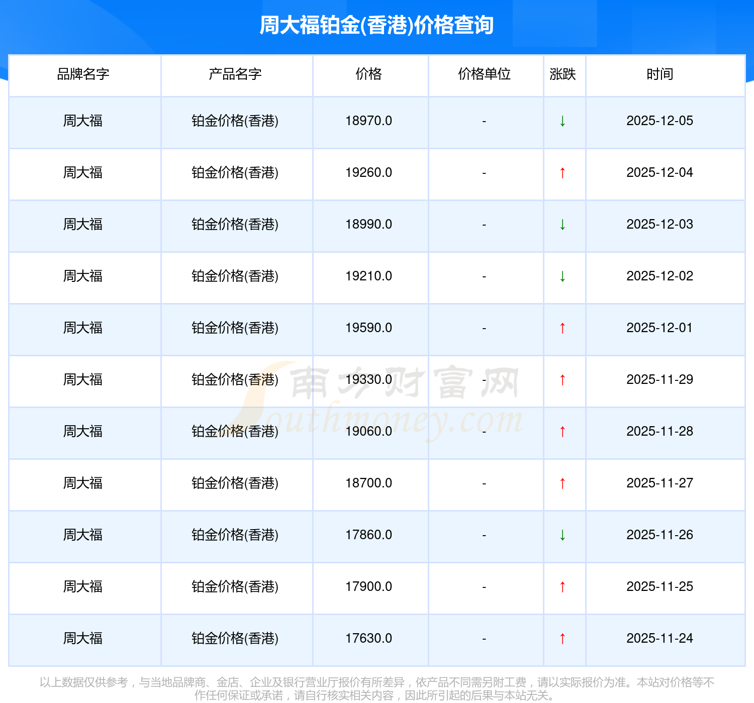 今日周大福鉑金價格(香港)的價格是18970.0。