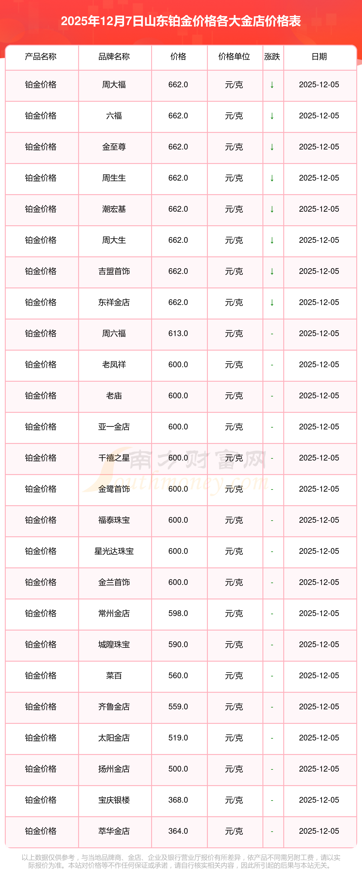 今天是2025年12月7日,山東周大福、周大福、周大福、周大福、周大福、周大福、周大福、老鳳祥、老鳳祥、老鳳祥、周六福等各大金店品牌鉑金價格最新價格行情是這樣的:周大福1328.0元/克、周大福662.0元/克、周大福1328.0元/克、周大福46550.0、周大福18970.0、周大福41990.0、周大福1165.0元/克、老鳳祥1325.0元/克、老鳳祥600.0元/克、老鳳祥1325.0元/克、周六福1289.0元/克。