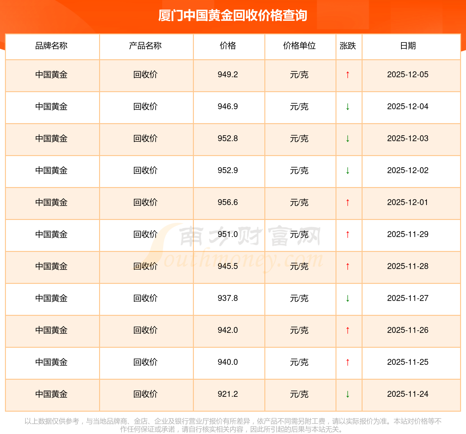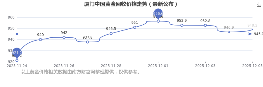 2025年12月7日這一天,廈門中國黃金的回收價以 949.2元/克的價格售賣。