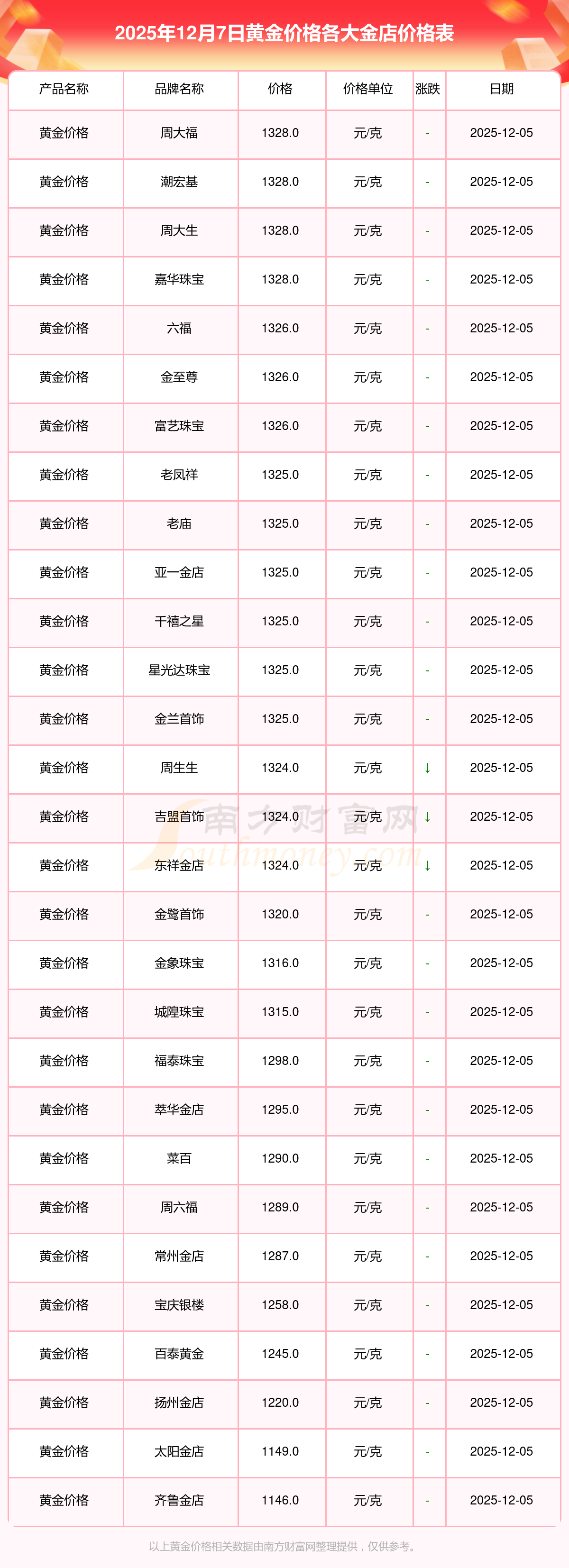 今天是2025年12月7日,周大福、周大福、周大福、周大福、周大福、周大福、周大福、老鳳祥、老鳳祥、老鳳祥、周六福等各大金店品牌黃金價格最新價格如下:周大福1328.0元/克、周大福662.0元/克、周大福1328.0元/克、周大福46550.0、周大福18970.0、周大福41990.0、周大福1165.0元/克、老鳳祥1325.0元/克、老鳳祥600.0元/克、老鳳祥1325.0元/克、周六福1289.0元/克。