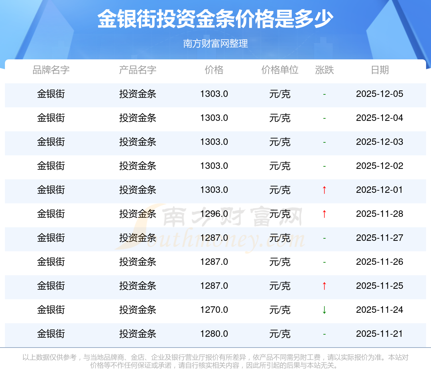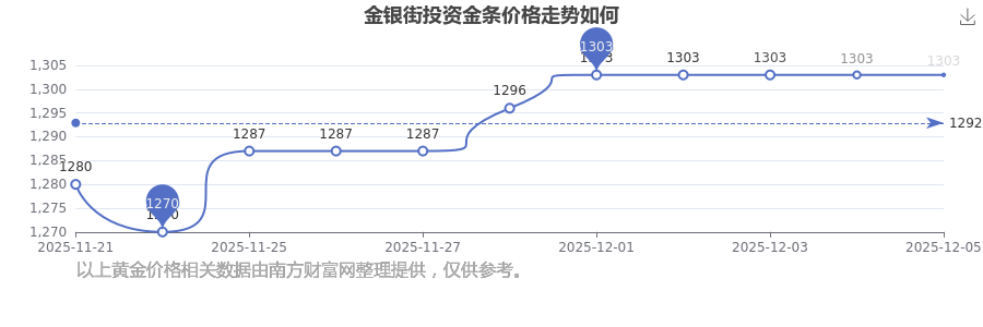 今日(2025年12月7日),金銀街投資金條最新價格為1303.0元/克。