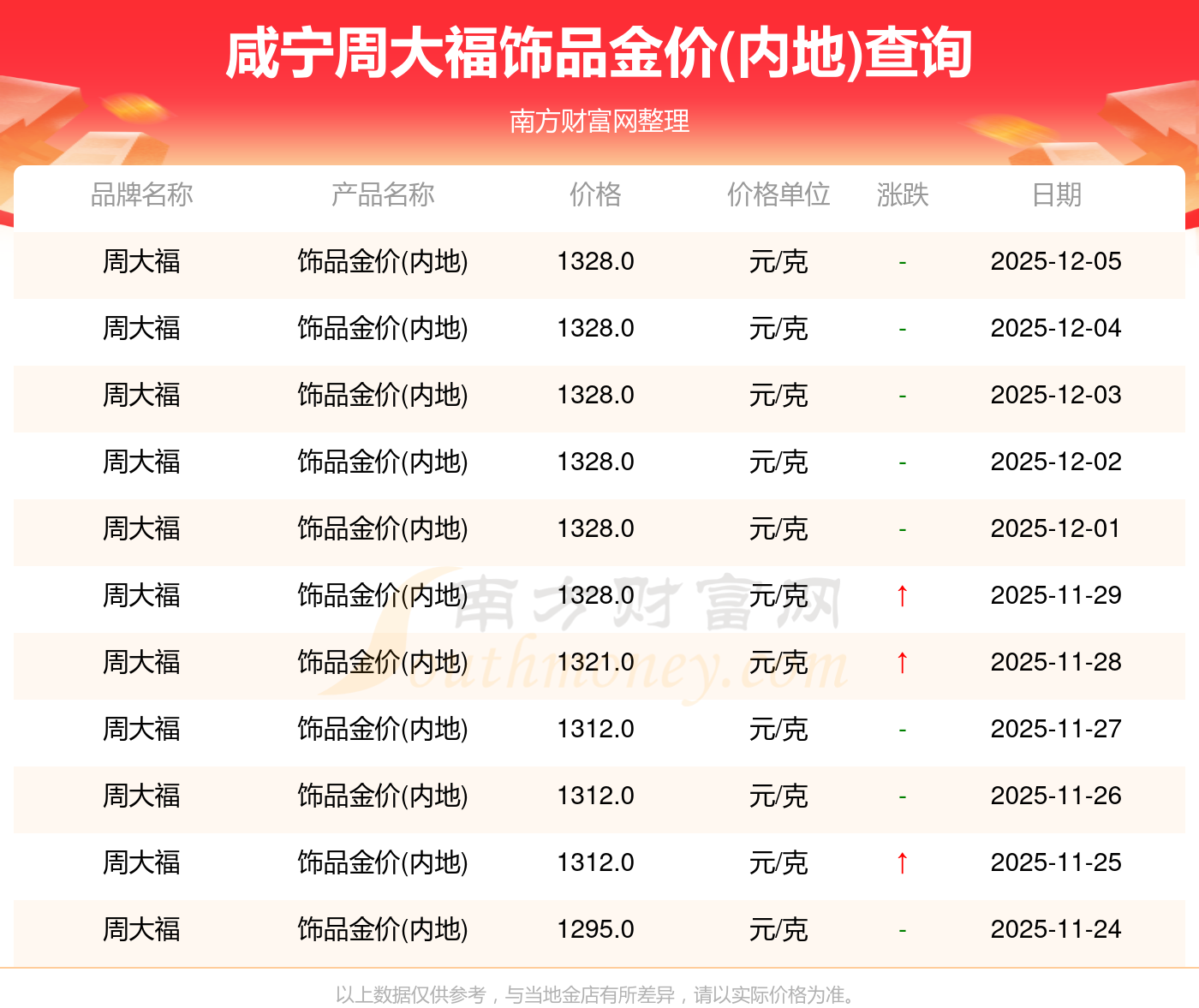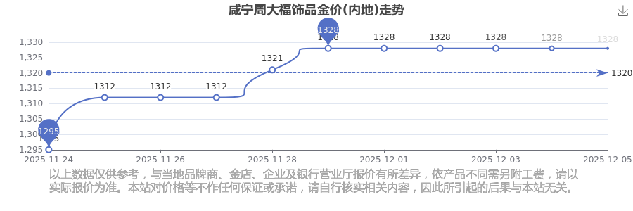 今日(2025年12月7日)咸寧周大福飾品金價(jià)(內(nèi)地)最新價(jià)格為1328.0元/克。