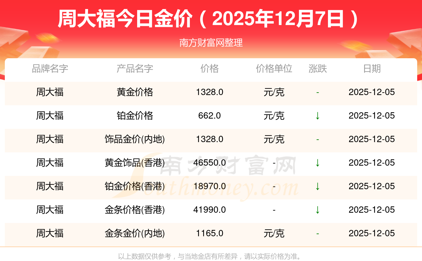 2025年12月7日周大福金價查詢:黃金價格1328.0元/克,鉑金價格662.0元/克,飾品金價(內地)1328.0元/克,黃金飾品(香港)46550.0,鉑金價格(香港)18970.0,金條價格(香港)41990.0,金條金價(內地)1165.0元/克,黃金價格1325.0元/克,鉑金價格600.0元/克,足金價格1325.0元/克,黃金價格1289.0元/克。
