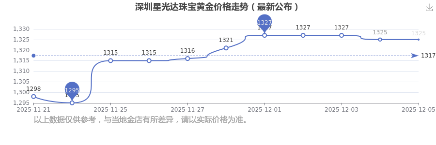 深圳星光達珠寶黃金價格現在每克多少錢,今日黃金一克的標價是多少?今日深圳星光達珠寶黃金價格查詢,今日深圳星光達珠寶黃金價格的價格為1325.0元/克。