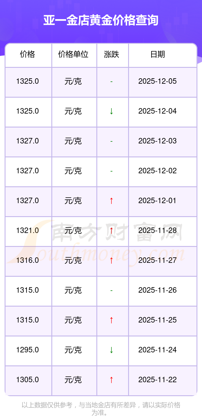 今日(2025年12月7日)亞一金店黃金價(jià)格是1325.0元/克。
