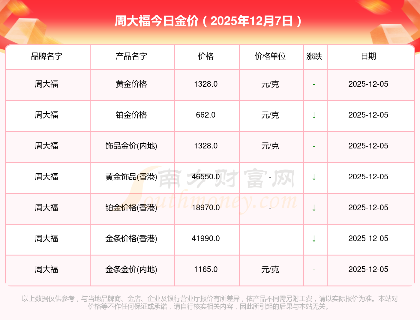 今天是2025年12月7日,周大福、周大福、周大福、周大福、周大福、周大福、周大福、老鳳祥、老鳳祥、老鳳祥、周六福等各大金店品牌黃金價格最新價格如下:周大福1328.0元/克、周大福662.0元/克、周大福1328.0元/克、周大福46550.0、周大福18970.0、周大福41990.0、周大福1165.0元/克、老鳳祥1325.0元/克、老鳳祥600.0元/克、老鳳祥1325.0元/克、周六福1289.0元/克。
