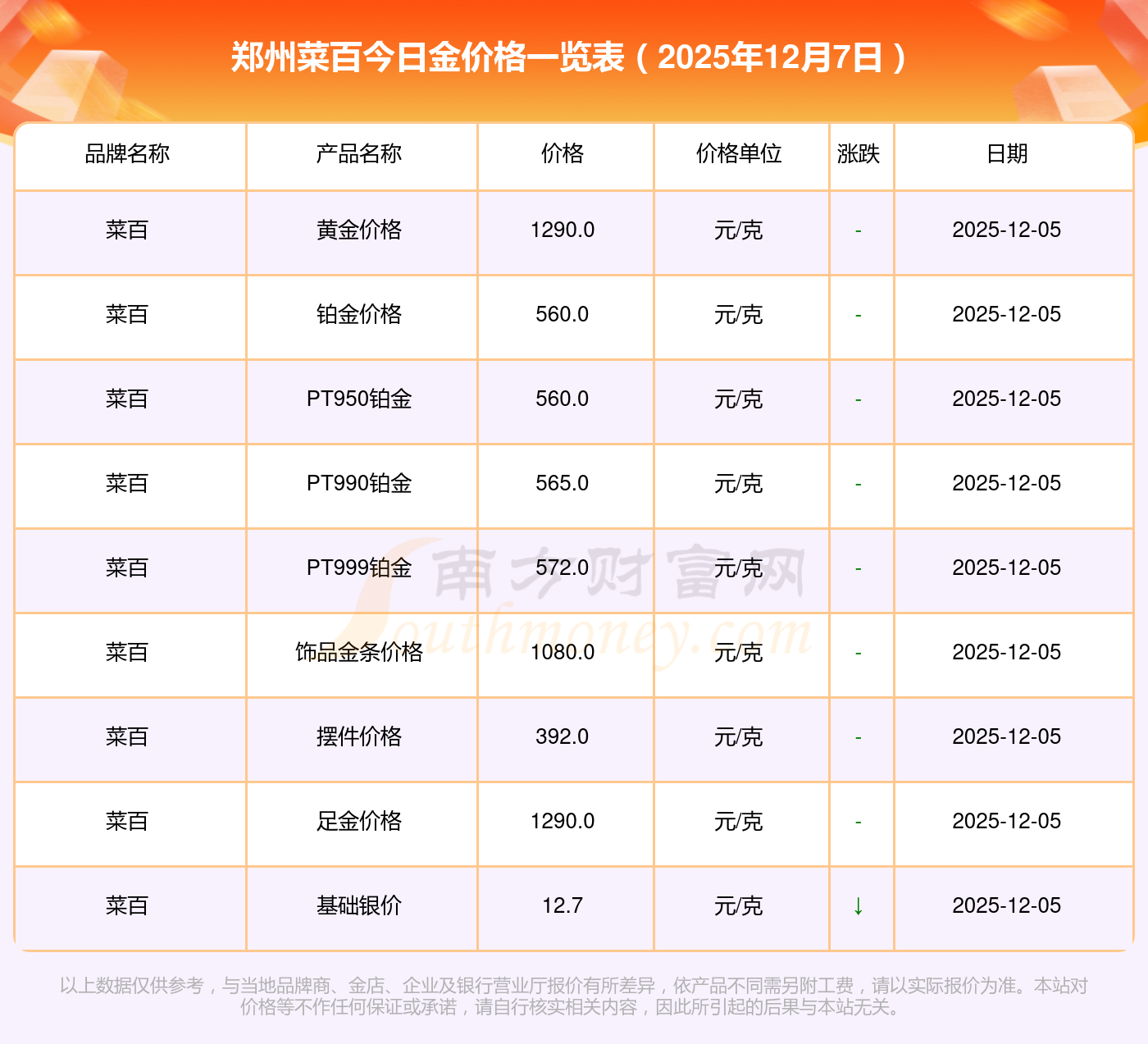 今天黃金價格是多少?現在黃金一克的價錢是怎樣的?2025年12月7日鄭州菜百黃金按克計價,現在多少錢一克?黃金價格1328.0元/克,鉑金價格662.0元/克,飾品金價(內地)1328.0元/克,黃金飾品(香港)46550.0,鉑金價格(香港)18970.0,金條價格(香港)41990.0,金條金價(內地)1165.0元/克,黃金價格1325.0元/克,鉑金價格600.0元/克,足金價格1325.0元/克,黃金價格1289.0元/克。