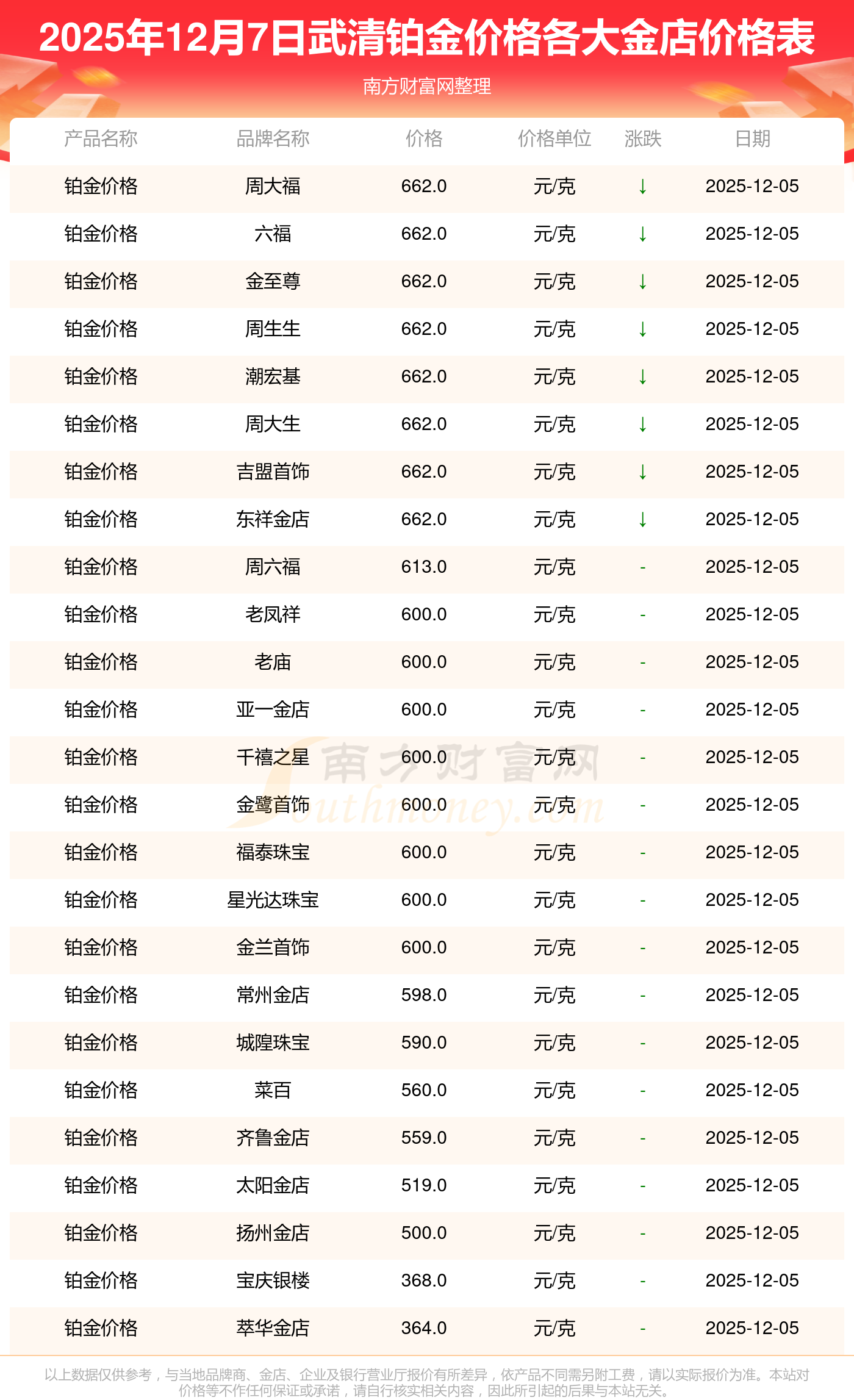 今天是2025年12月7日,武清周大福、周大福、周大福、周大福、周大福、周大福、周大福、老鳳祥、老鳳祥、老鳳祥、周六福等各大金店品牌鉑金價格最新價格行情是這樣的:周大福1328.0元/克、周大福662.0元/克、周大福1328.0元/克、周大福46550.0、周大福18970.0、周大福41990.0、周大福1165.0元/克、老鳳祥1325.0元/克、老鳳祥600.0元/克、老鳳祥1325.0元/克、周六福1289.0元/克。