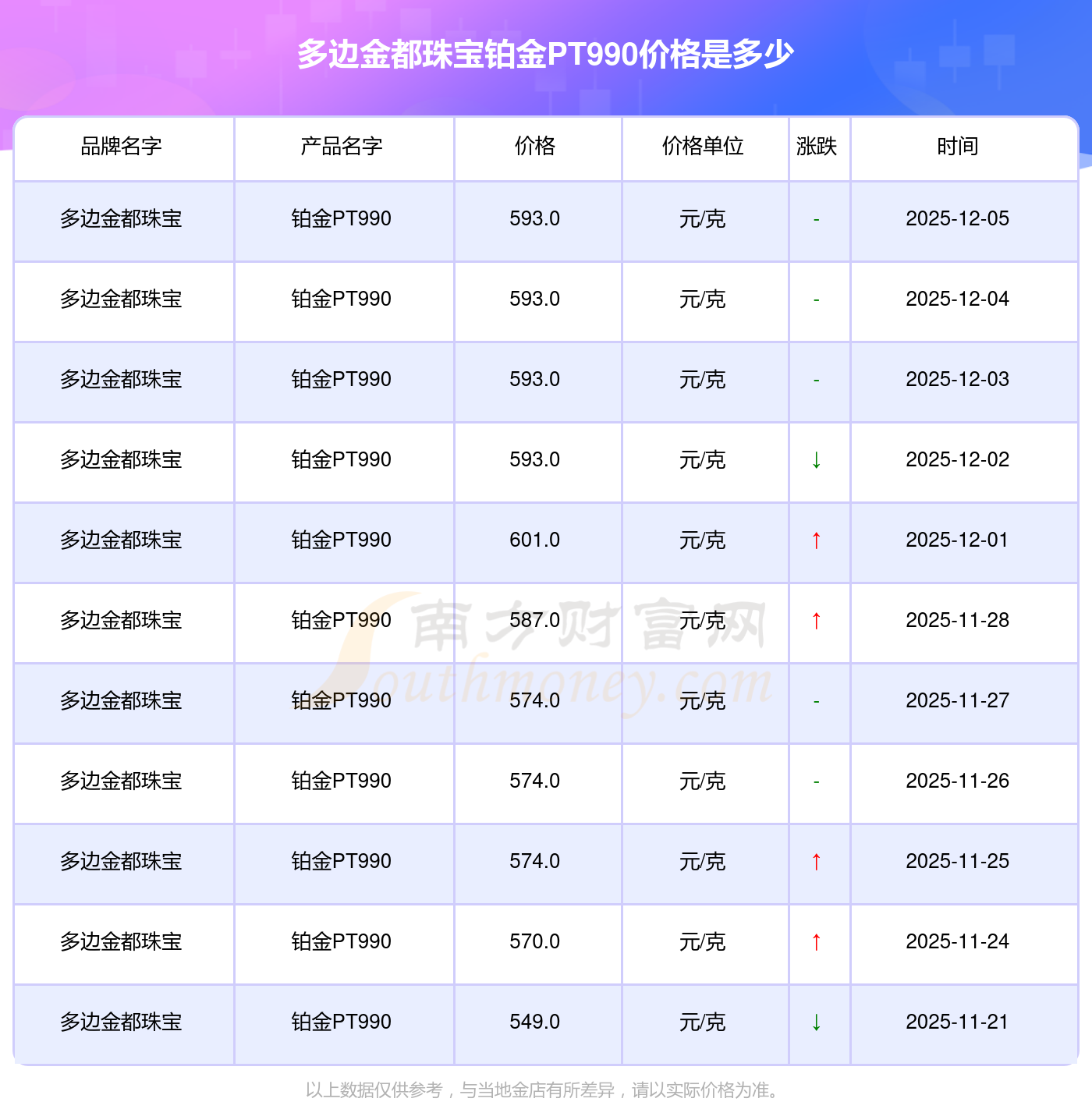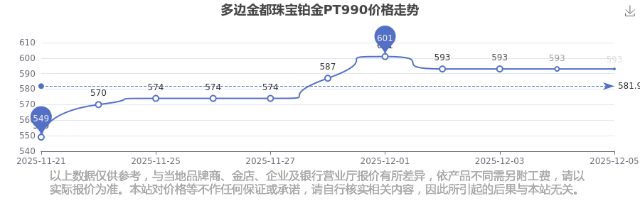今日多邊金都珠寶鉑金PT990的價格是593.0元/克。