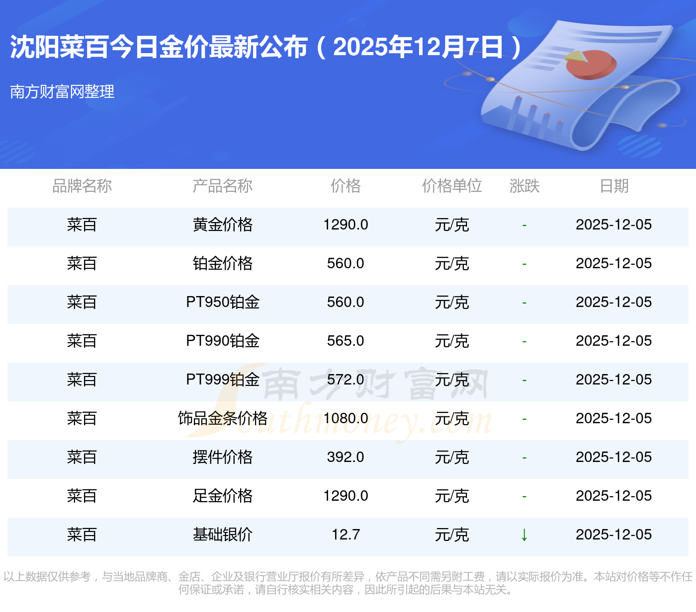 今天黃金價格行情怎樣?此刻每克黃金售價多少?2025年12月7日沈陽菜百黃金一克的市場行情價是多少?黃金價格1328.0元/克,鉑金價格662.0元/克,飾品金價(內地)1328.0元/克,黃金飾品(香港)46550.0,鉑金價格(香港)18970.0,金條價格(香港)41990.0,金條金價(內地)1165.0元/克,黃金價格1325.0元/克,鉑金價格600.0元/克,足金價格1325.0元/克,黃金價格1289.0元/克。