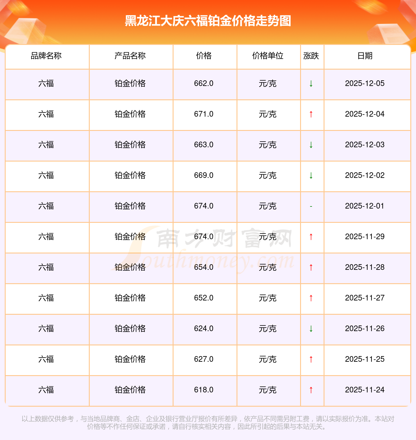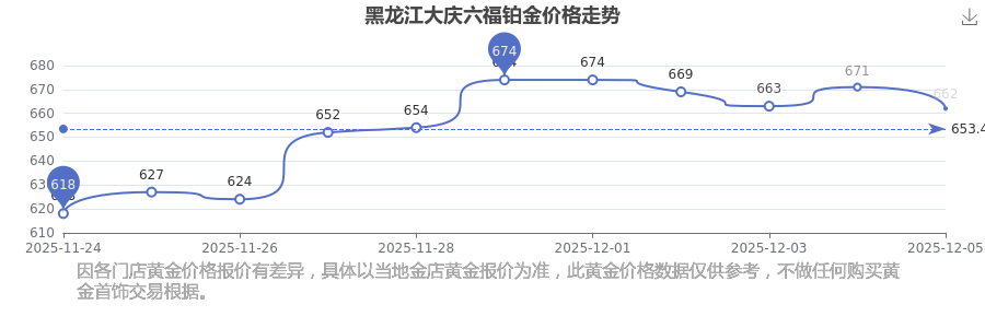 黑龍江大慶六福在 2025年12月7日,鉑金價格的售賣價格是 662.0元/克。