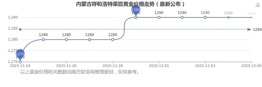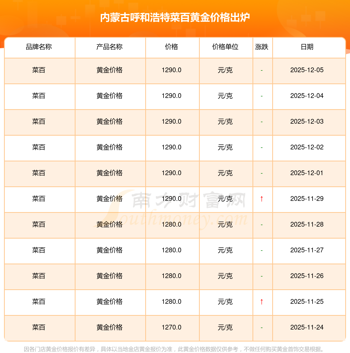 2025年12月7日,內(nèi)蒙古呼和浩特菜百的黃金價(jià)格標(biāo)價(jià)達(dá)到 1290.0元/克。