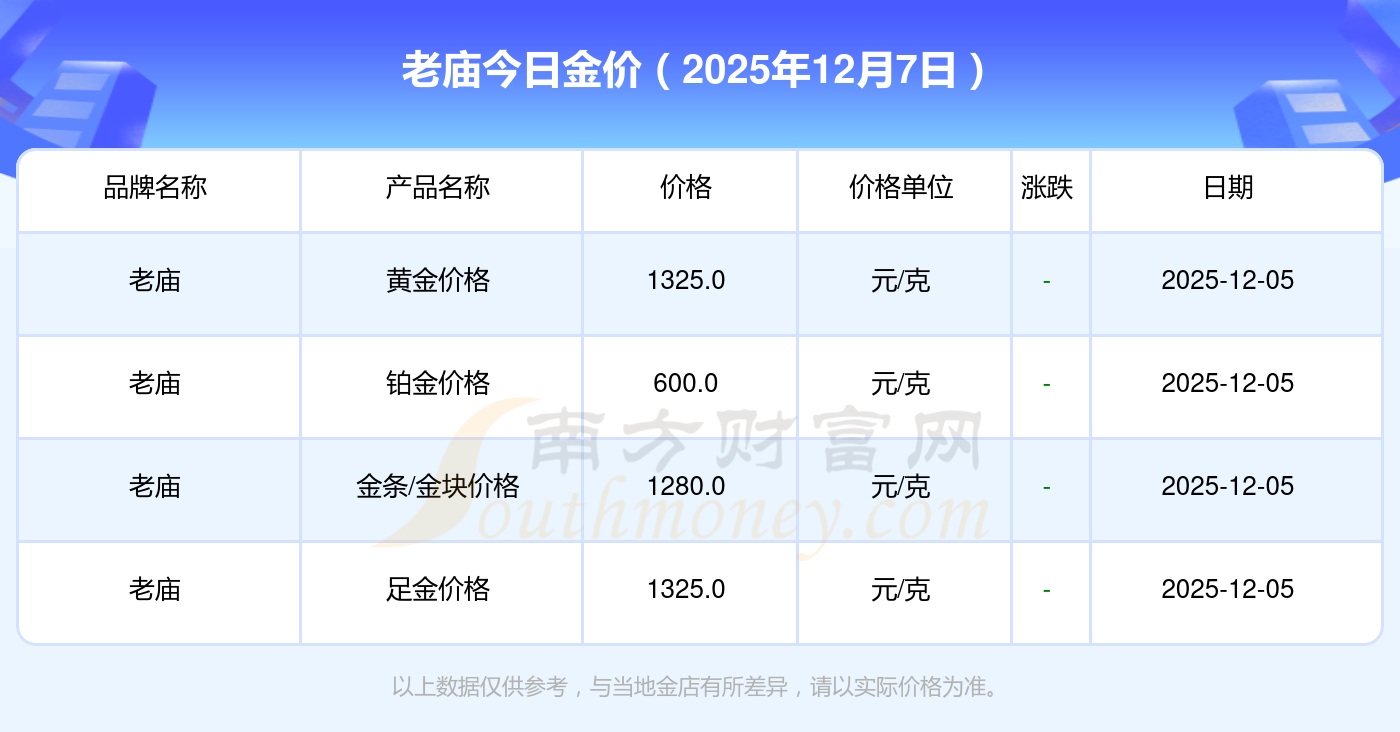 2025年12月7日各大金店黃金價格最新價格:周大福1328.0元/克,周大福662.0元/克,周大福1328.0元/克,周大福46550.0,周大福18970.0,周大福41990.0,周大福1165.0元/克,老鳳祥1325.0元/克,老鳳祥600.0元/克,老鳳祥1325.0元/克,周六福1289.0元/克。