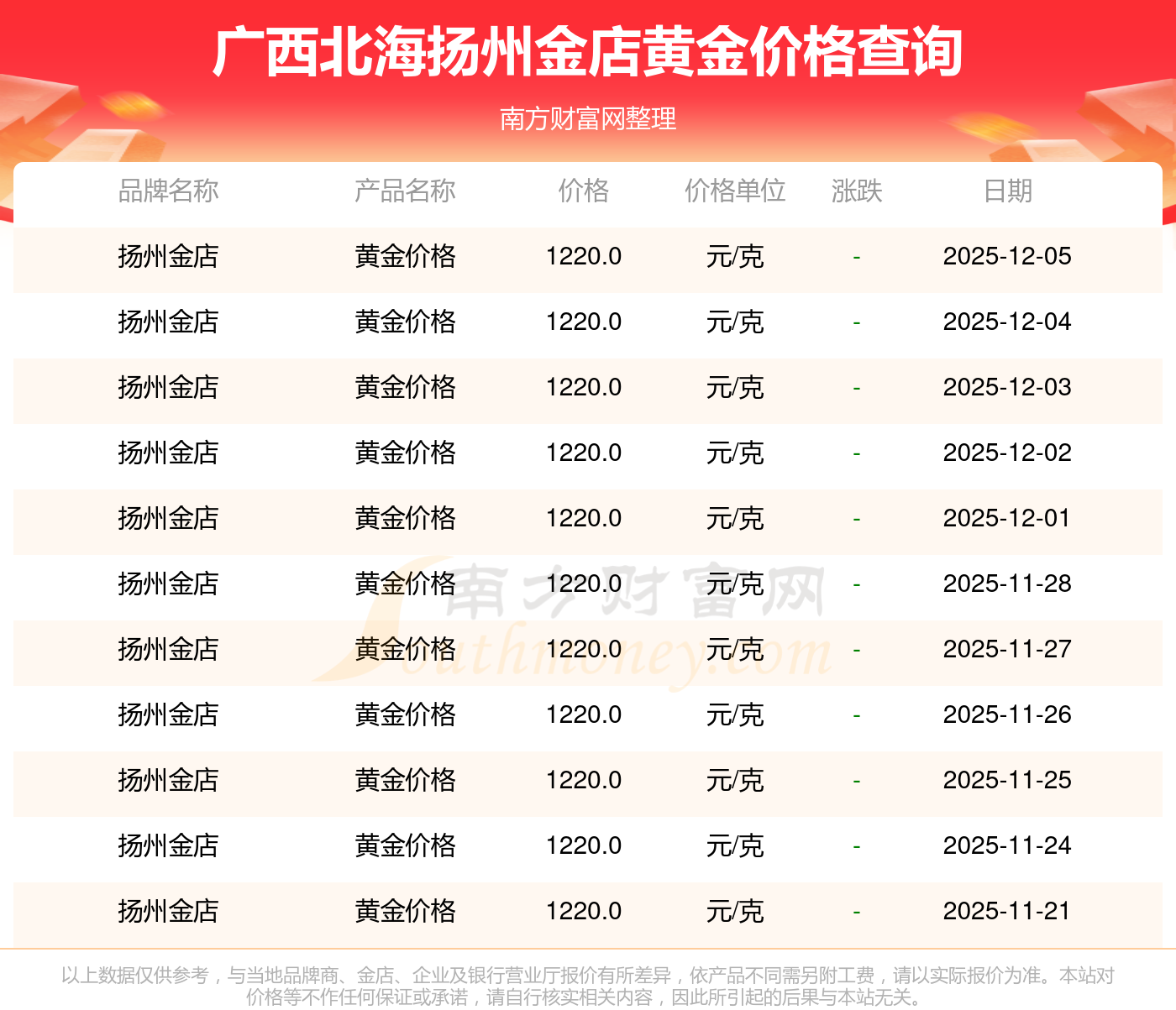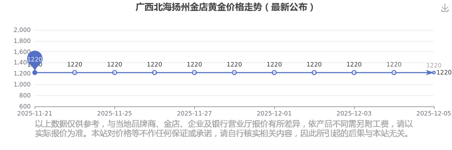 廣西北海揚州金店黃金價格每克多少錢,今天黃金一克的價格具體是多少?今日廣西北海揚州金店黃金價格查詢,今日廣西北海揚州金店黃金價格為1220.0元/克。