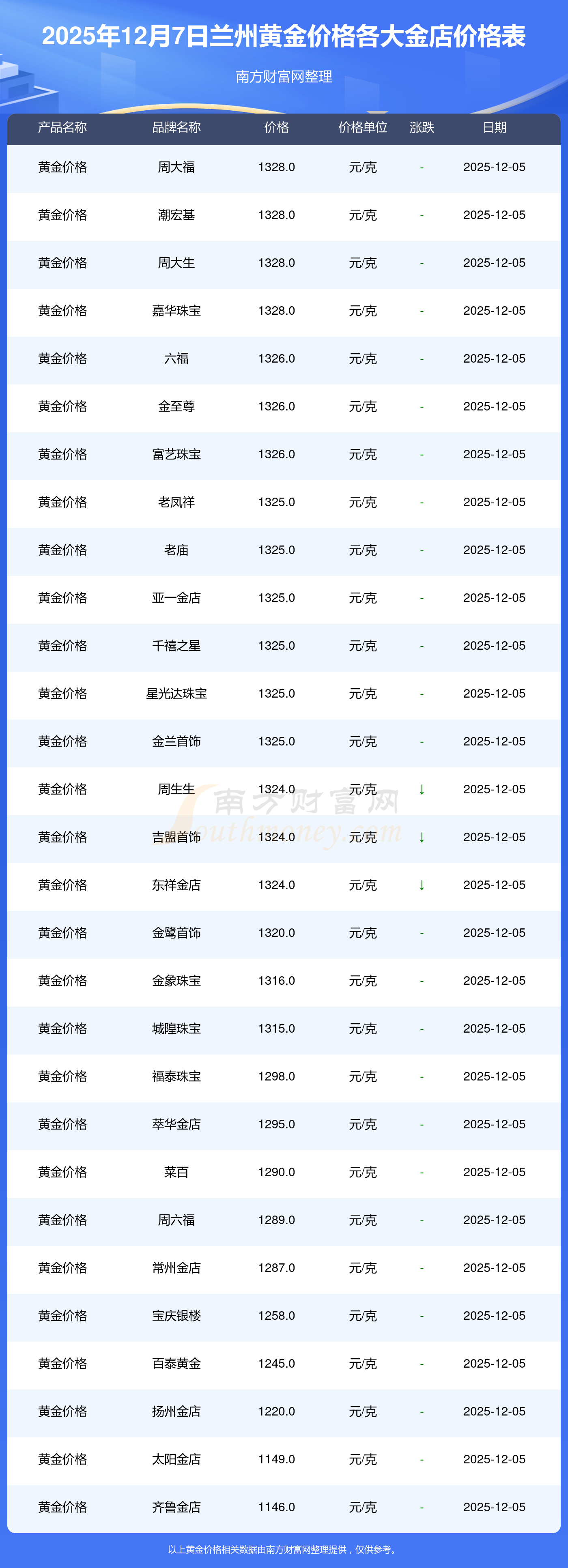 2025年12月7日蘭州各大金店黃金價格最新價格:周大福1328.0元/克,周大福662.0元/克,周大福1328.0元/克,周大福46550.0,周大福18970.0,周大福41990.0,周大福1165.0元/克,老鳳祥1325.0元/克,老鳳祥600.0元/克,老鳳祥1325.0元/克,周六福1289.0元/克。