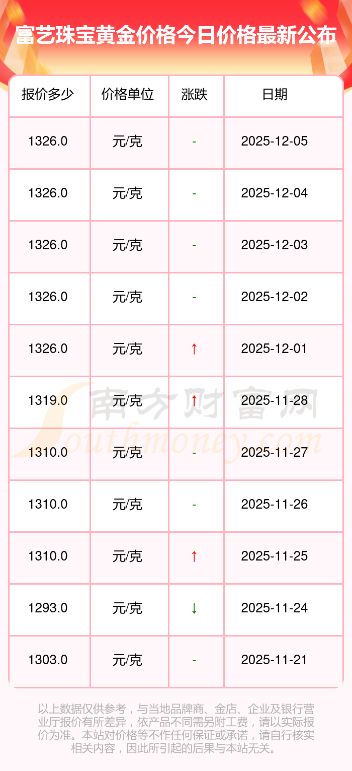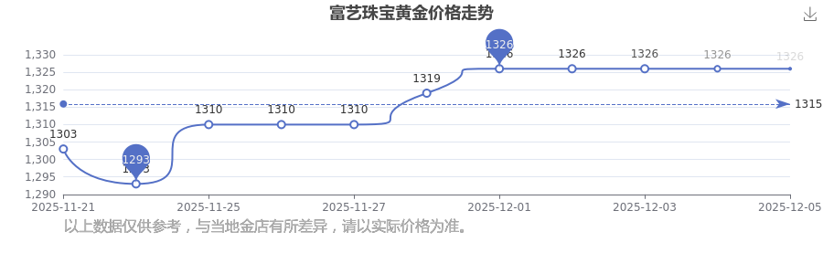 今日富藝珠寶 黃金價格的最新定價為1326.0元/克。