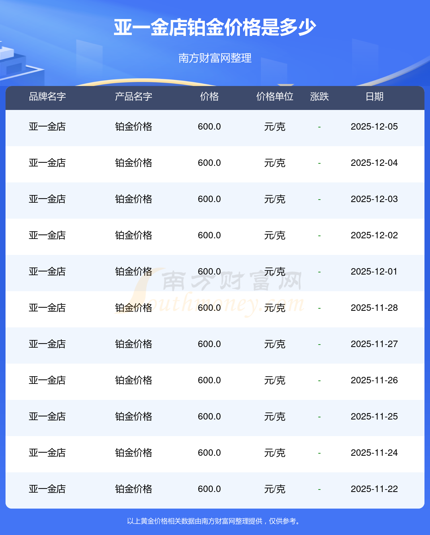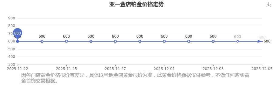今日(2025年12月7日)亞一金店鉑金價格的價格為600.0元/克。