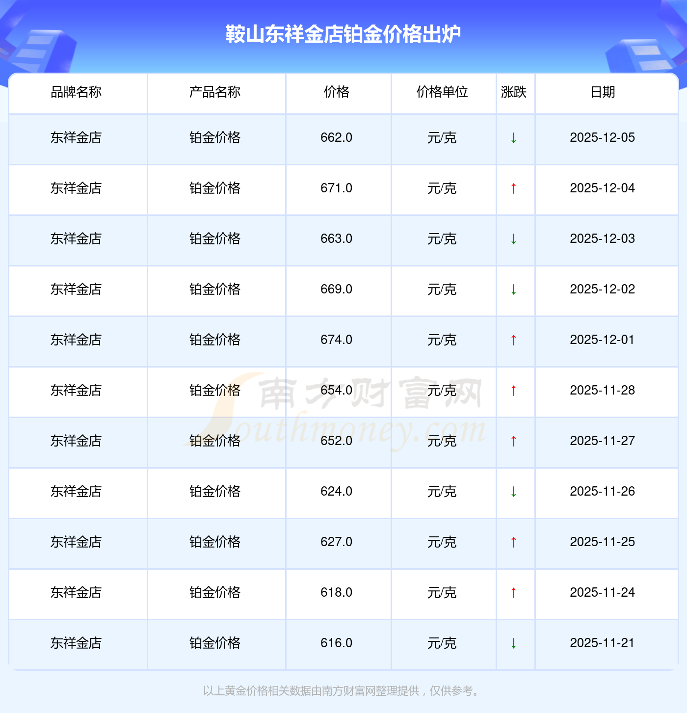 2025年12月7日這一天,鞍山東祥金店的鉑金價格以 662.0元/克的價格售賣。