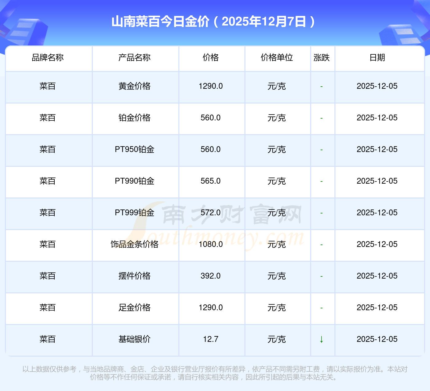 2025年12月7日山南菜百一克黃金的售價是多少:黃金價格1328.0元/克,鉑金價格662.0元/克,飾品金價(內地)1328.0元/克,黃金飾品(香港)46550.0,鉑金價格(香港)18970.0,金條價格(香港)41990.0,金條金價(內地)1165.0元/克,黃金價格1325.0元/克,鉑金價格600.0元/克,足金價格1325.0元/克,黃金價格1289.0元/克。