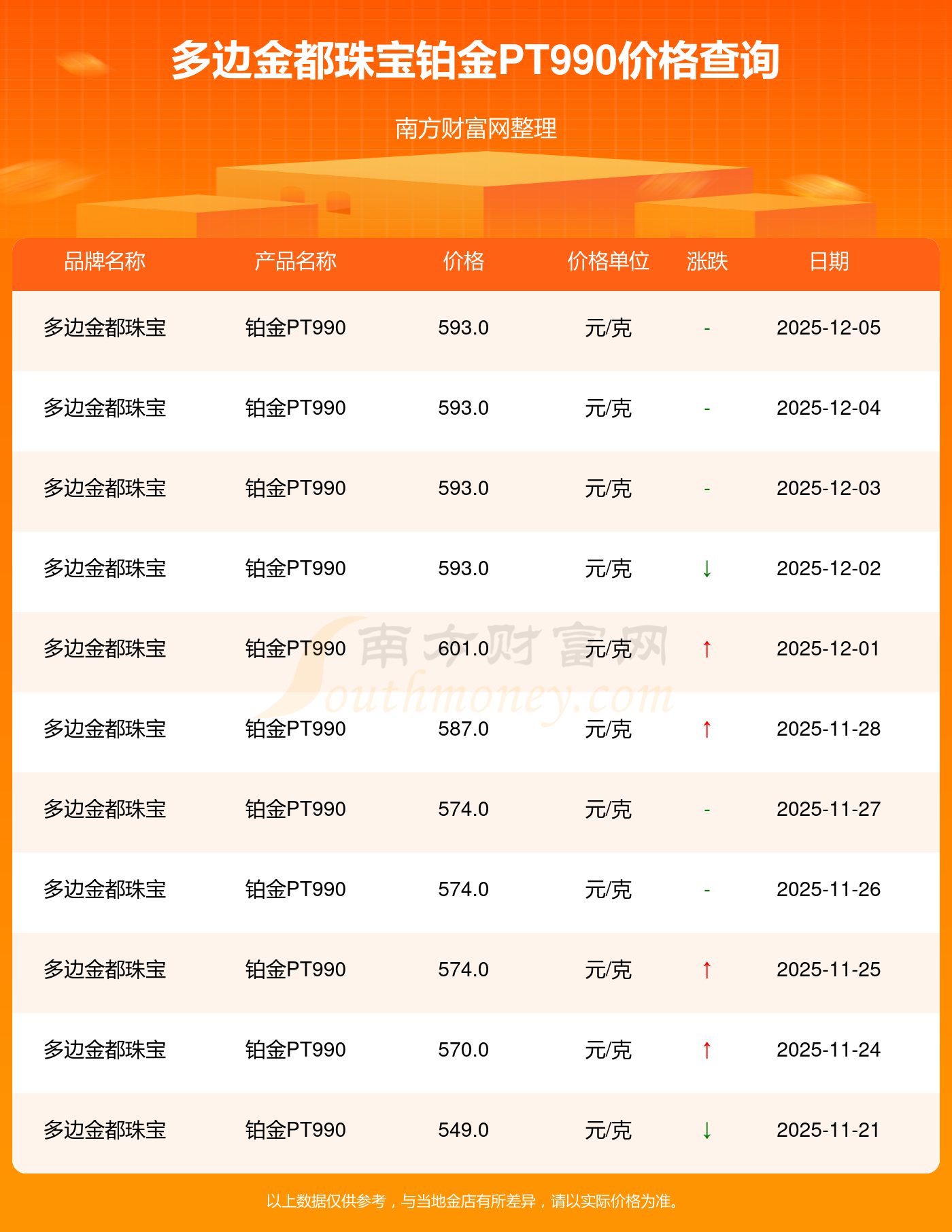 2025年12月7日多邊金都珠寶鉑金PT990價格:593.0元/克。