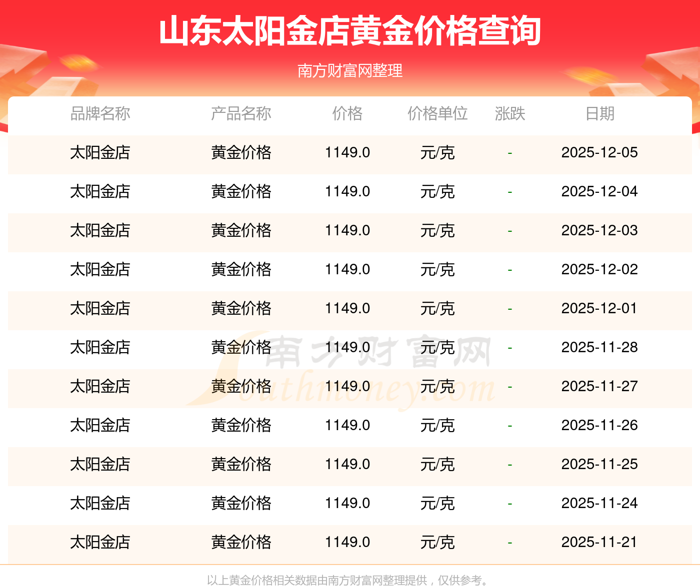 今日(2025年12月7日),山東太陽(yáng)金店黃金價(jià)格的定價(jià)為 1149.0元/克。