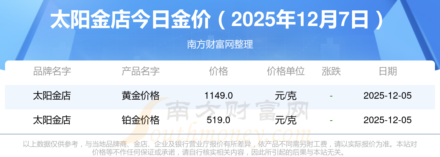 2025年12月7日各大金店黃金價格最新價格:周大福1328.0元/克,周大福662.0元/克,周大福1328.0元/克,周大福46550.0,周大福18970.0,周大福41990.0,周大福1165.0元/克,老鳳祥1325.0元/克,老鳳祥600.0元/克,老鳳祥1325.0元/克,周六福1289.0元/克。