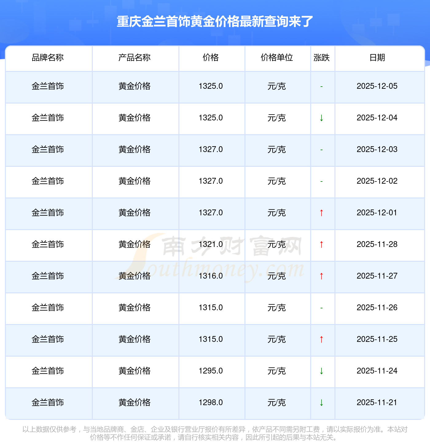今日重慶金蘭首飾黃金價格是1325.0元/克。