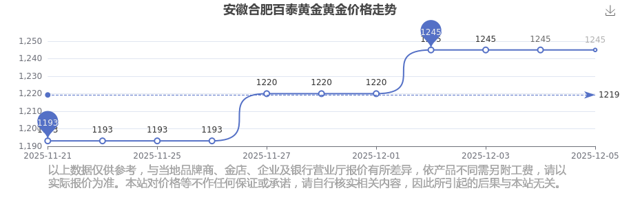 于 2025年12月7日,安徽合肥百泰黃金黃金價格的克價為1245.0元/克。