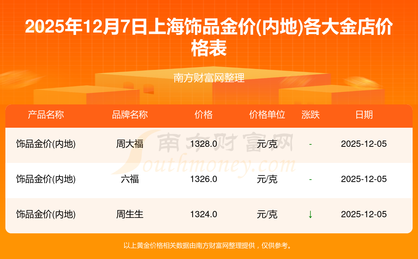 二、2025年12月7日上海各金店飾品金價(內地)最新一覽表