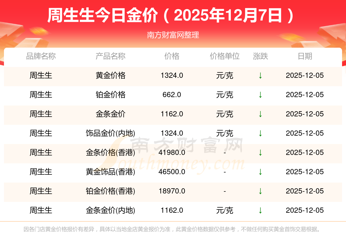 2025年12月7日周生生金價查詢:黃金價格1328.0元/克,鉑金價格662.0元/克,飾品金價(內地)1328.0元/克,黃金飾品(香港)46550.0,鉑金價格(香港)18970.0,金條價格(香港)41990.0,金條金價(內地)1165.0元/克,黃金價格1325.0元/克,鉑金價格600.0元/克,足金價格1325.0元/克,黃金價格1289.0元/克。