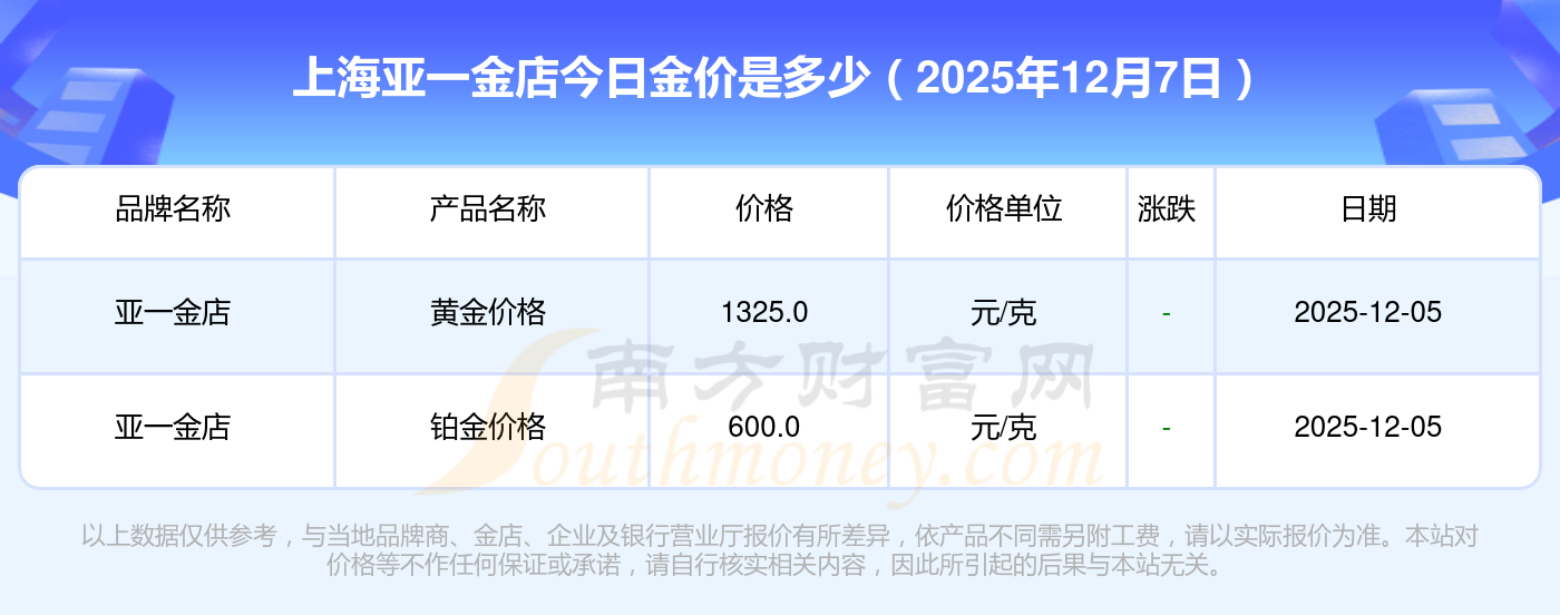 2025年12月7日上海亞一金店一克黃金對應的價格是多少?黃金價格1328.0元/克,鉑金價格662.0元/克,飾品金價(內地)1328.0元/克,黃金飾品(香港)46550.0,鉑金價格(香港)18970.0,金條價格(香港)41990.0,金條金價(內地)1165.0元/克,黃金價格1325.0元/克,鉑金價格600.0元/克,足金價格1325.0元/克,黃金價格1289.0元/克。