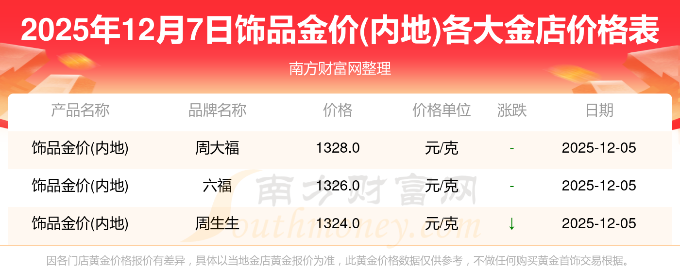 今天是2025年12月7日,周大福、周大福、周大福、周大福、周大福、周大福、周大福、老鳳祥、老鳳祥、老鳳祥、周六福等各大金店品牌飾品金價(jià)(內(nèi)地)最新價(jià)格如下:周大福1328.0元/克、周大福662.0元/克、周大福1328.0元/克、周大福46550.0、周大福18970.0、周大福41990.0、周大福1165.0元/克、老鳳祥1325.0元/克、老鳳祥600.0元/克、老鳳祥1325.0元/克、周六福1289.0元/克。