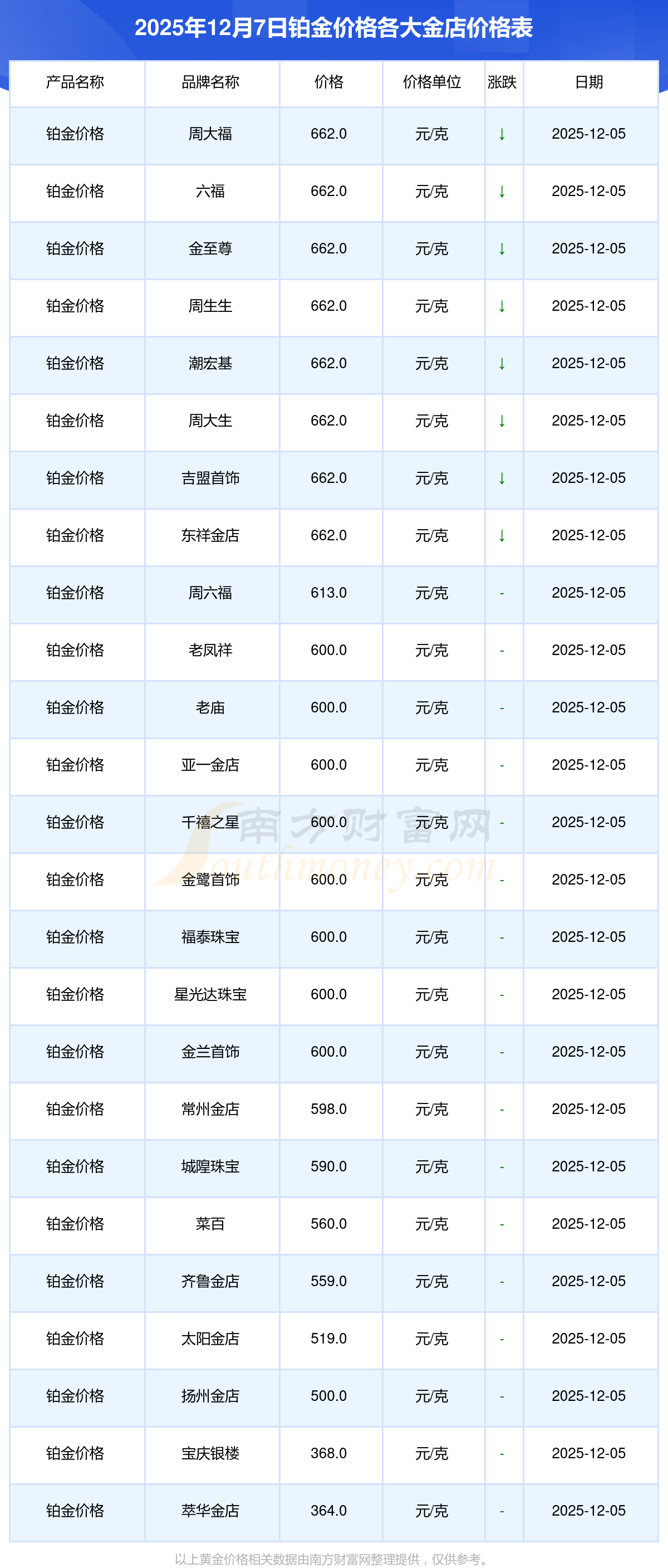 2025年12月7日各大金店鉑金價格最新價格:周大福1328.0元/克,周大福662.0元/克,周大福1328.0元/克,周大福46550.0,周大福18970.0,周大福41990.0,周大福1165.0元/克,老鳳祥1325.0元/克,老鳳祥600.0元/克,老鳳祥1325.0元/克,周六福1289.0元/克。