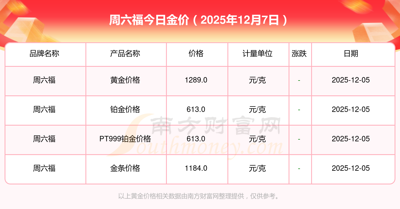 今天是2025年12月7日,周大福、周大福、周大福、周大福、周大福、周大福、周大福、老鳳祥、老鳳祥、老鳳祥、周六福等各大金店品牌黃金價格最新價格如下:周大福1328.0元/克、周大福662.0元/克、周大福1328.0元/克、周大福46550.0、周大福18970.0、周大福41990.0、周大福1165.0元/克、老鳳祥1325.0元/克、老鳳祥600.0元/克、老鳳祥1325.0元/克、周六福1289.0元/克。