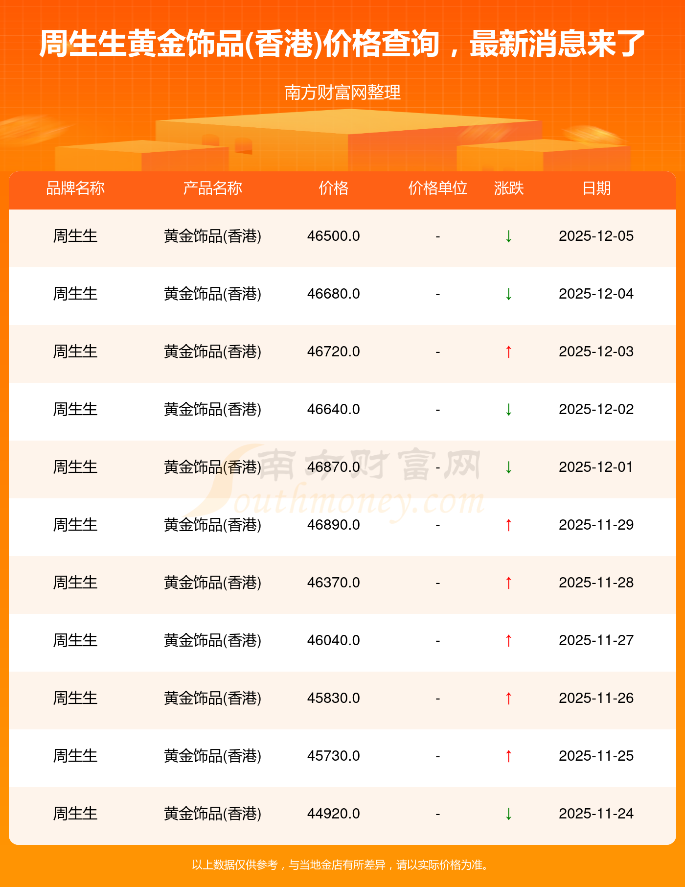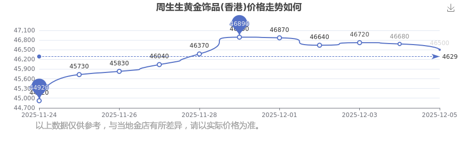 據(jù)了解,周生生今日黃金飾品(香港)價格為46500.0。
