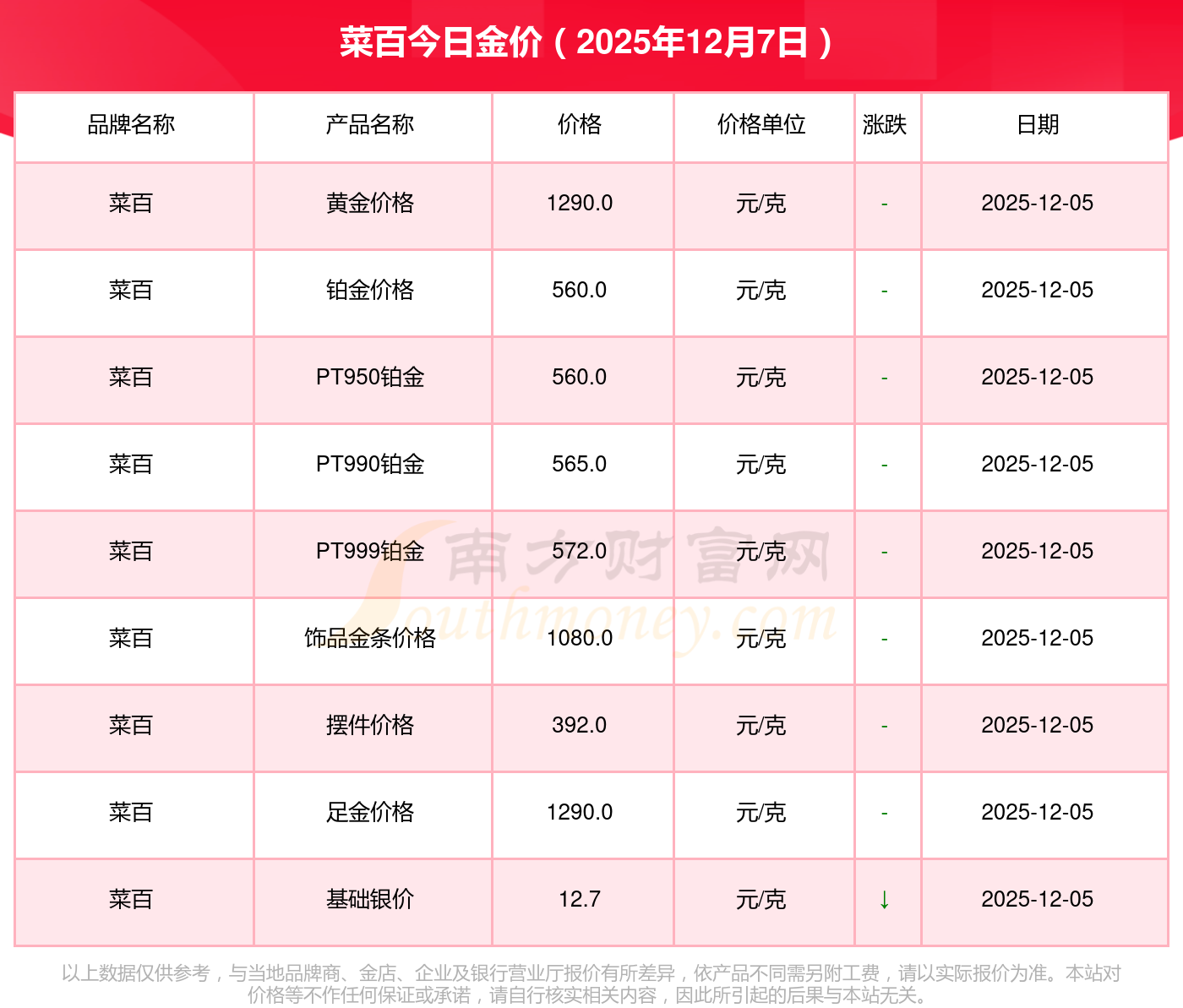 因各門店黃金價格報價有差異,具體以當(dāng)?shù)亟鸬挈S金報價為準(zhǔn),此黃金價格數(shù)據(jù)僅供參考,不做任何購買黃金首飾交易根據(jù)。