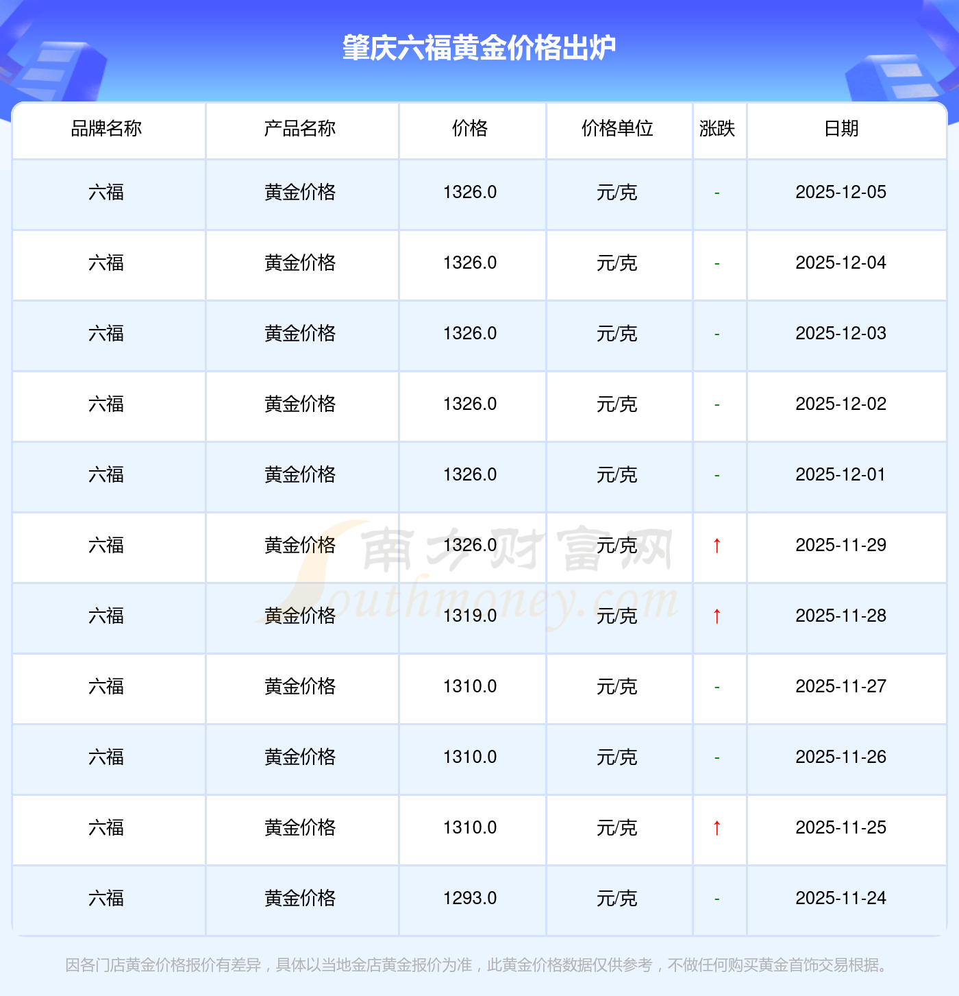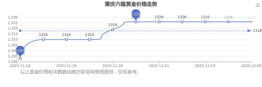 今日(2025年12月7日)肇慶六福黃金價格是1326.0元/克。