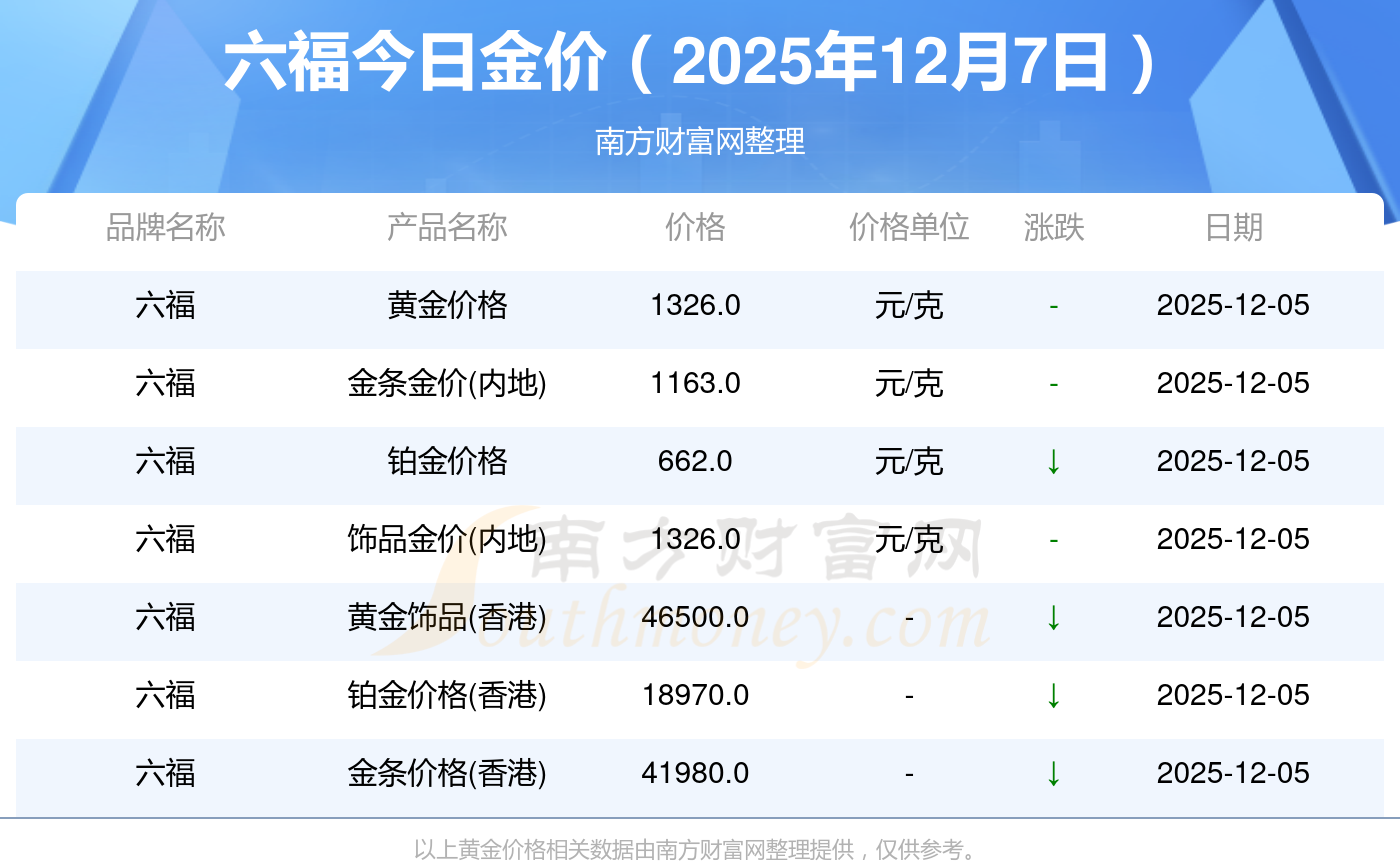 2025年12月7日六福今日價格:黃金價格1328.0元/克,鉑金價格662.0元/克,飾品金價(內地)1328.0元/克,黃金飾品(香港)46550.0,鉑金價格(香港)18970.0,金條價格(香港)41990.0,金條金價(內地)1165.0元/克,黃金價格1325.0元/克,鉑金價格600.0元/克,足金價格1325.0元/克,黃金價格1289.0元/克。