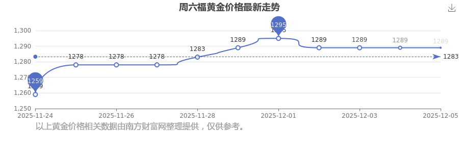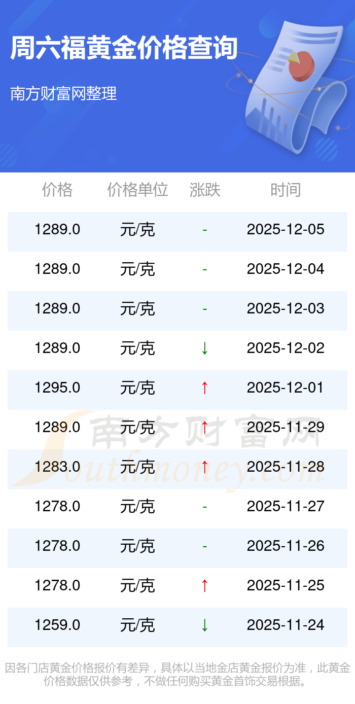今日(2025年12月7日),周六福黃金價格:1289.0元/克。