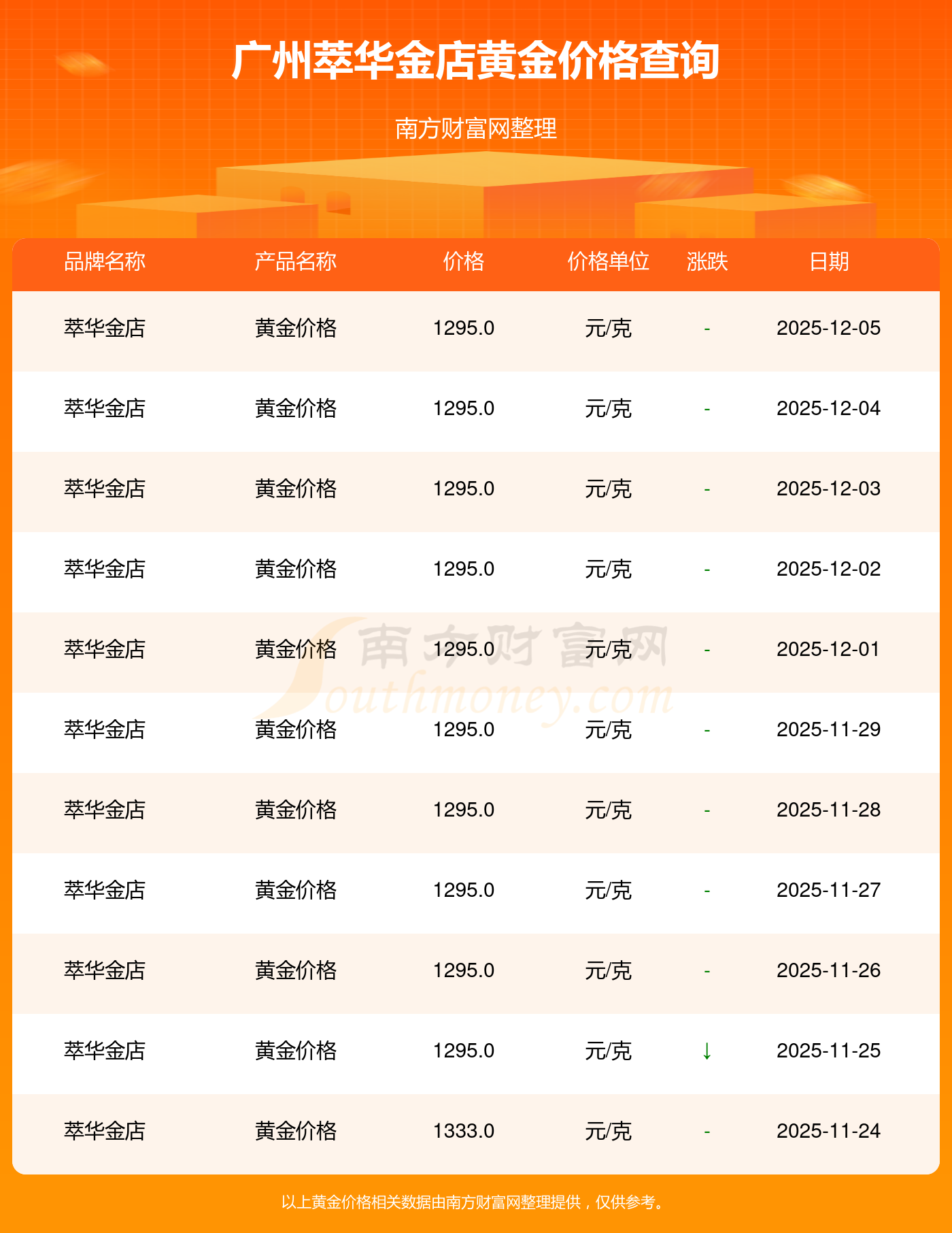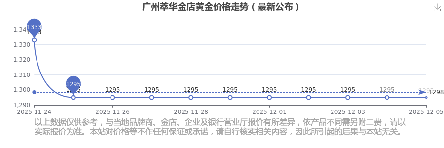 今日廣州萃華金店黃金價格的價格為1295.0元/克。